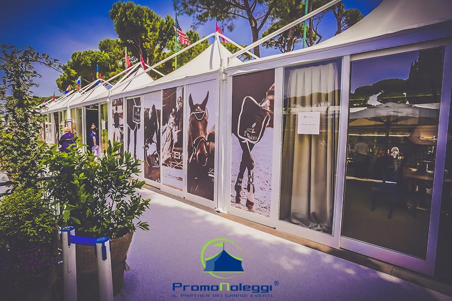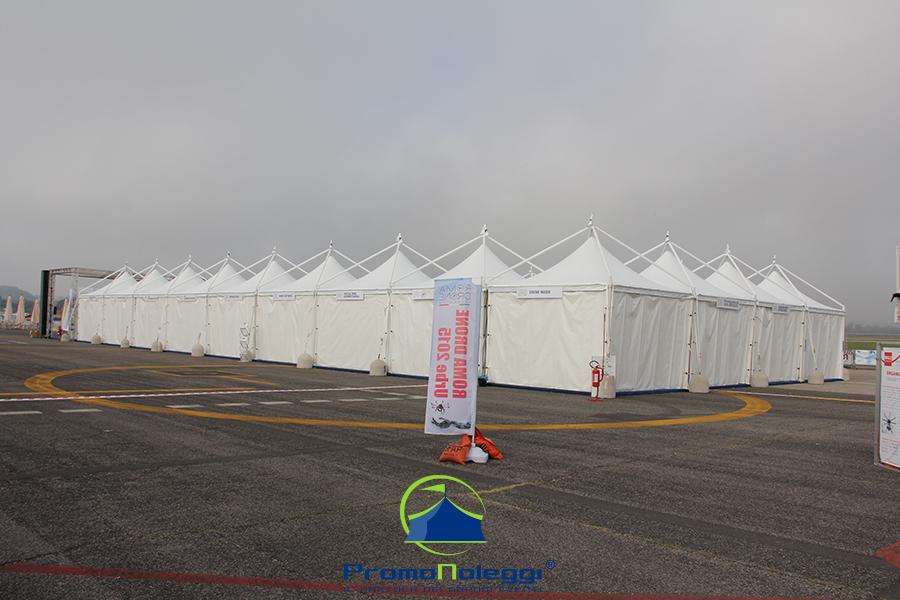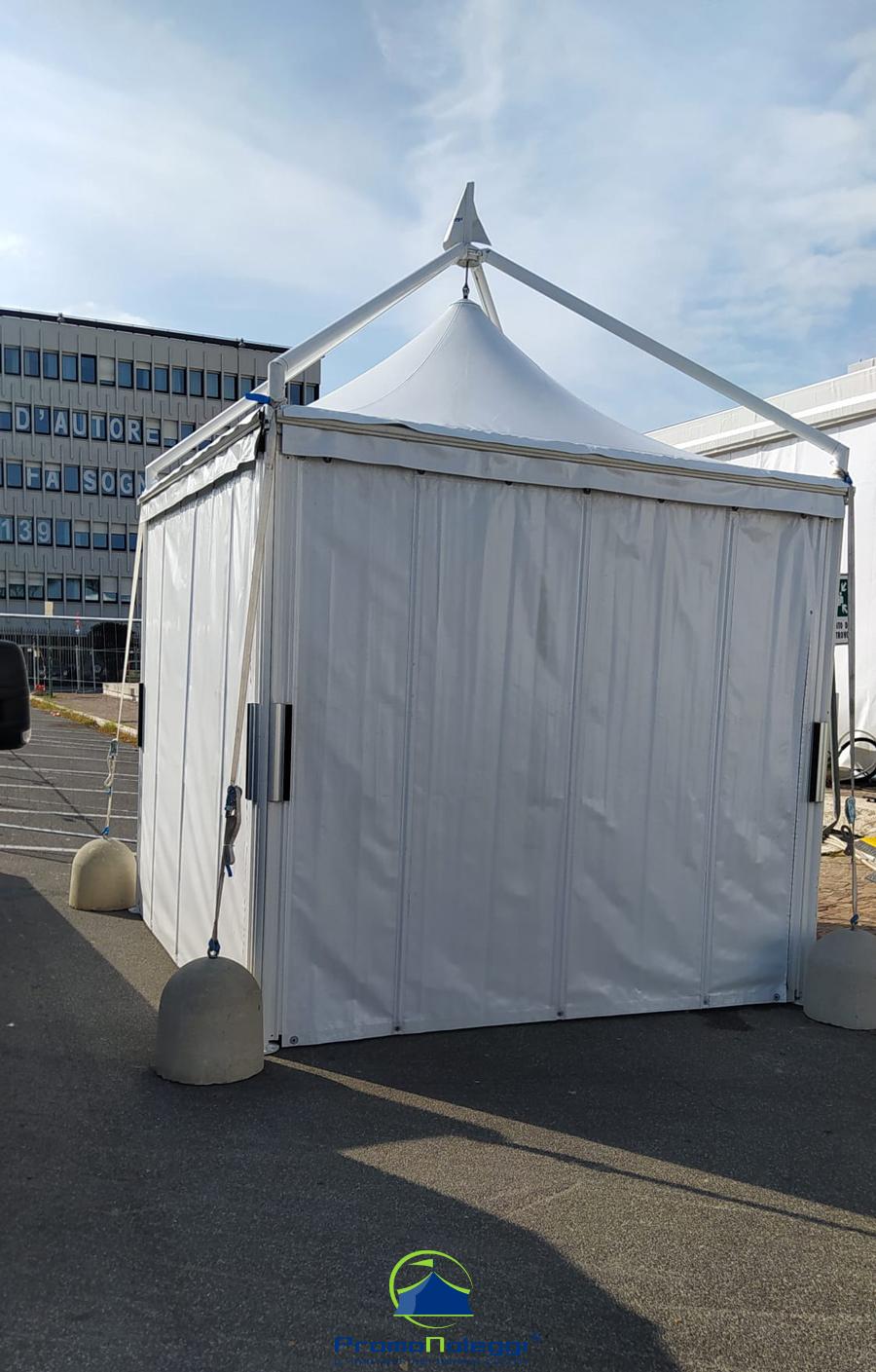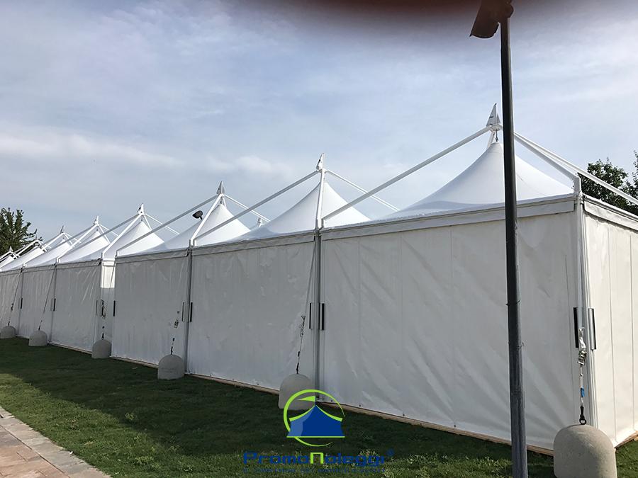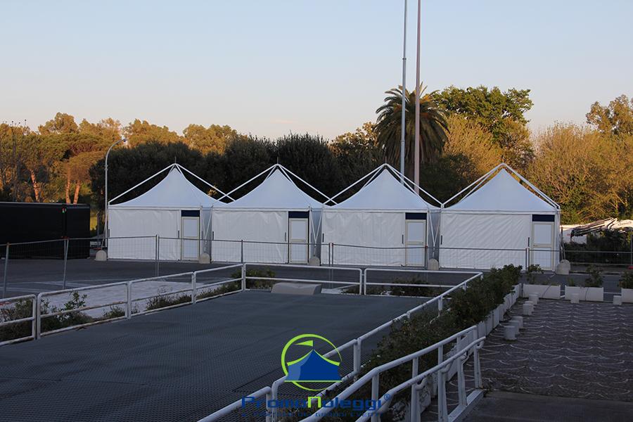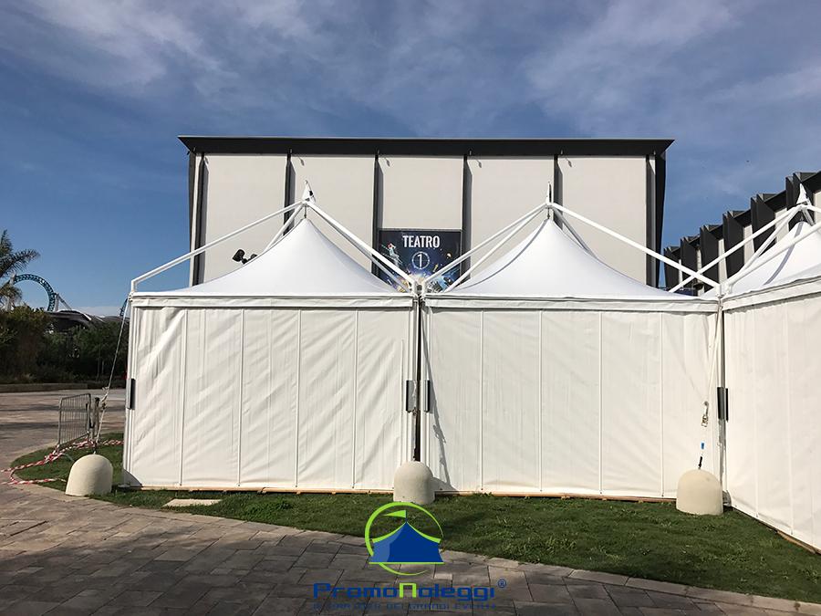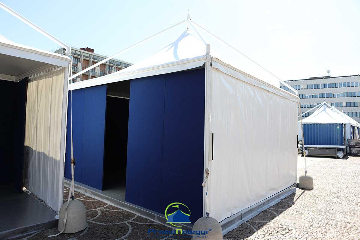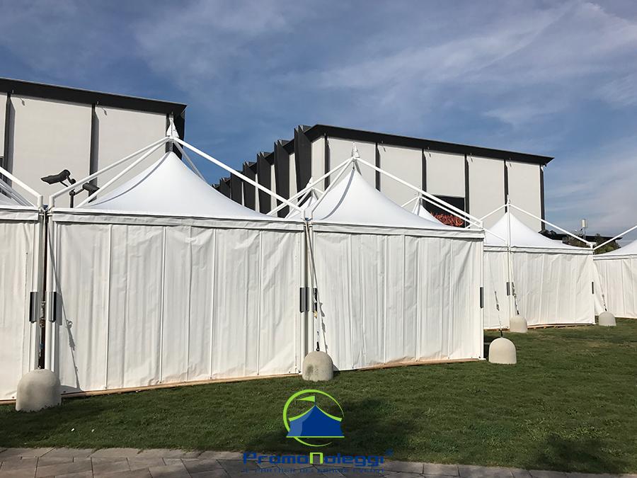 Tutti i moduli standard a noleggio sono realizzati con telaio in alluminio anodizzato e la copertura e i teli laterali in tessuto PVC ignifugo. E’ possibile richiedere la versione con teli scorrevoli laterali, con pannellatura rigida trasparente o senza chiusura.