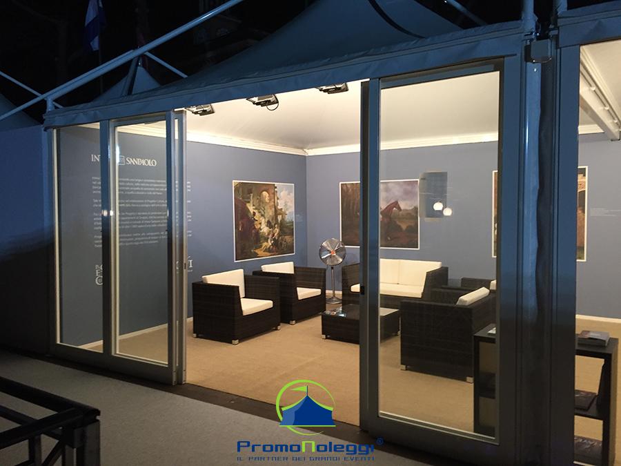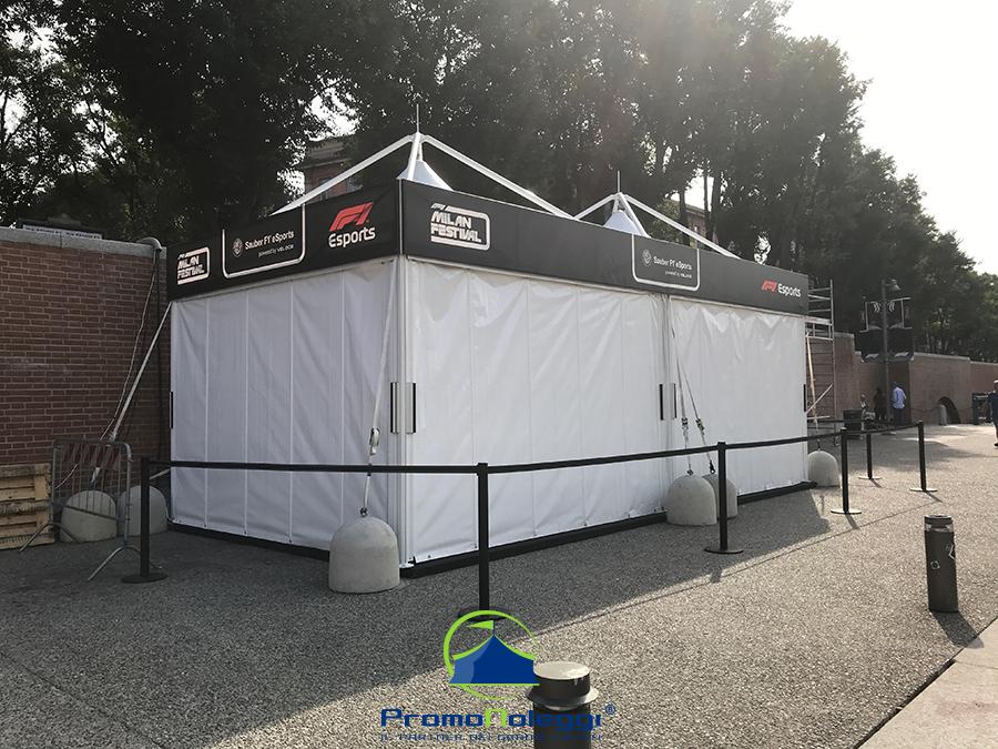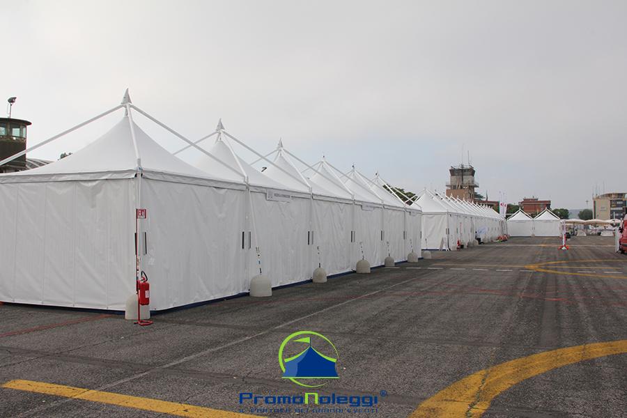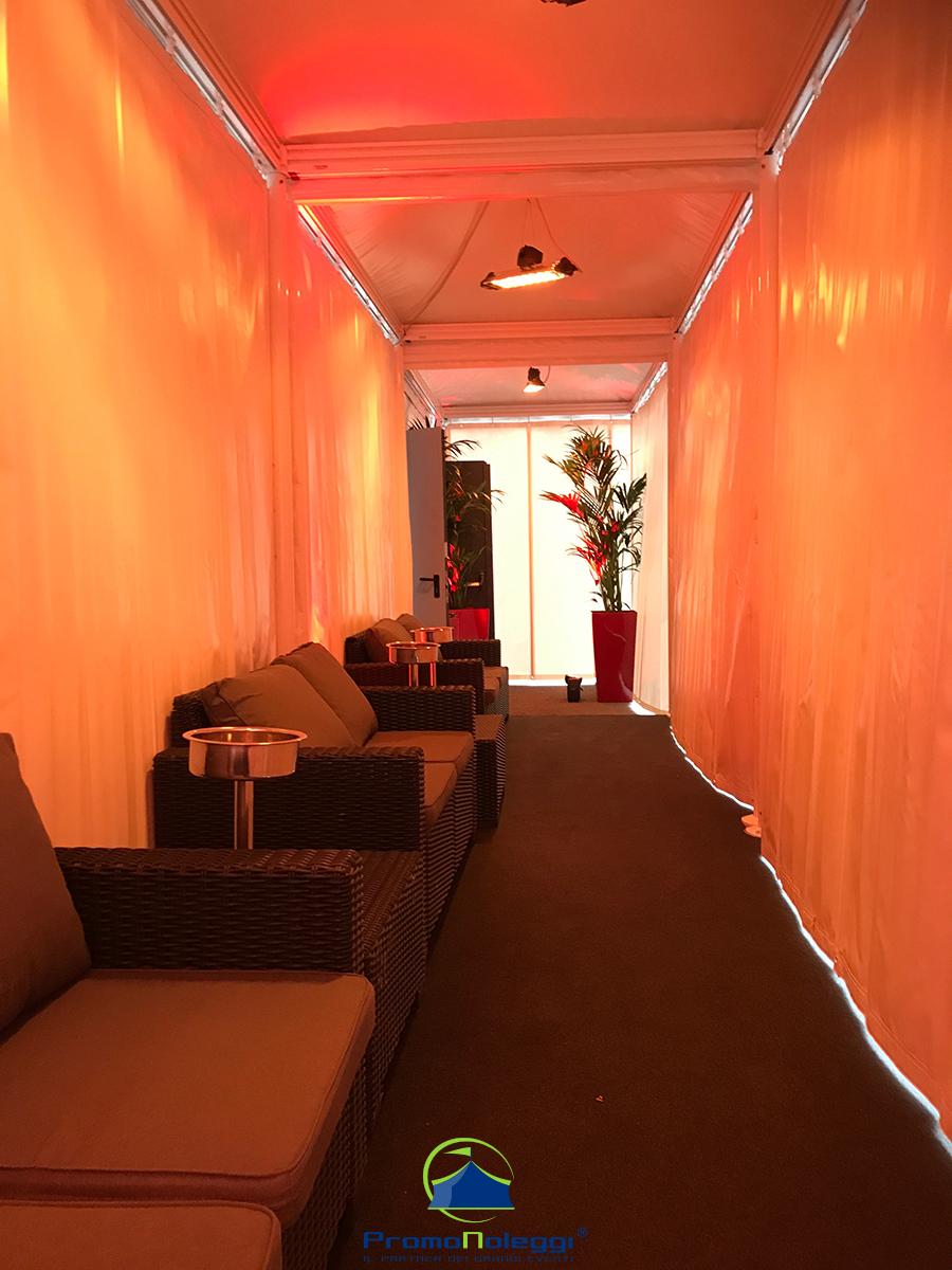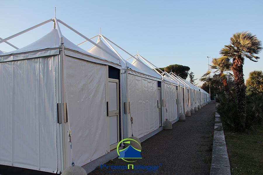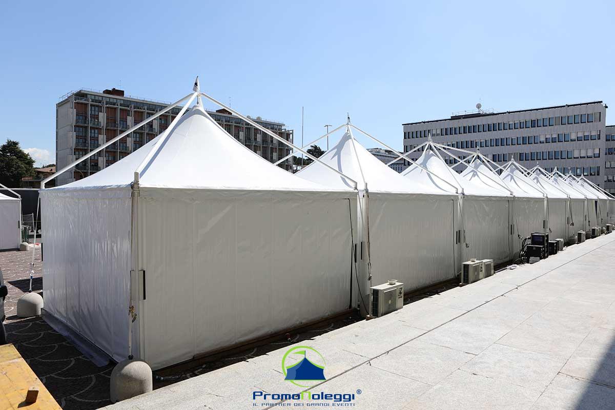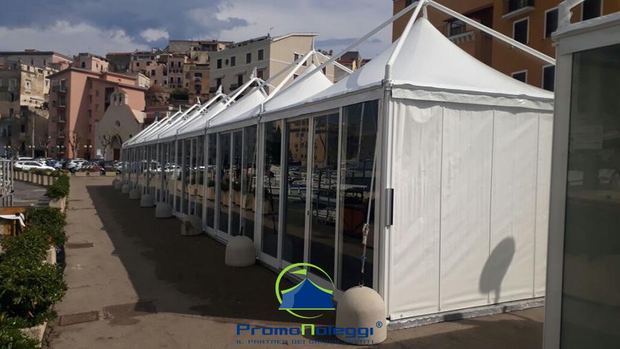 Tutti i moduli standard a noleggio sono realizzati con telaio in alluminio anodizzato e la copertura e i teli laterali in tessuto PVC ignifugo. E’ possibile richiedere la versione con teli scorrevoli laterali, con pannellatura rigida trasparente o senza chiusura.